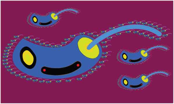 Blue and yellow colour big and small art object display on red background